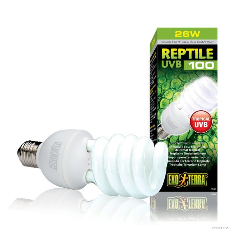 The Exo Terra Reptile UVB100 emits optimal levels of UVB, similar to that of shady environments such as rain forests or other tropical locations. Reptiles living in these habitats receive moderate UV radiation due to climatological conditions (fairly high humidity, changes in weather, etc) that prevent unfiltered sunlight from reaching the reptile’s basking site. The optimal Vitamin D3 yield index ensures vitamin D3 photosynthesis to aid calcium absorption and prevent metabolic diseases.