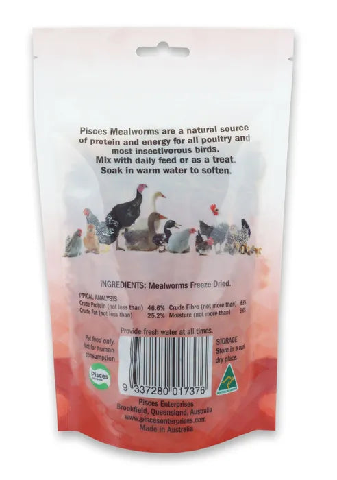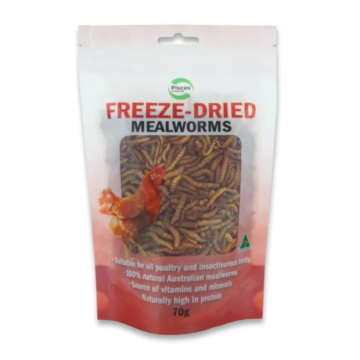 Australian Grown freeze dried mealworms, perfect for your chicken. Just rehydrate and serve. High in protein!