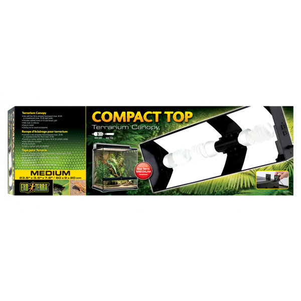 The Exo Terra Compact Top Canopy is a compact fluorescent terrarium canopy designed for use with the Exo Terra Glass Terrarium. This easy-to-install canopy accommodates compact fluorescent bulbs or low wattage incandescent bulbs. A combination of different Exo Terra Repti Glo compact fluorescent bulbs can be used to create the ideal ultraviolet/visual light ratio or a combination with an incandescent light source.