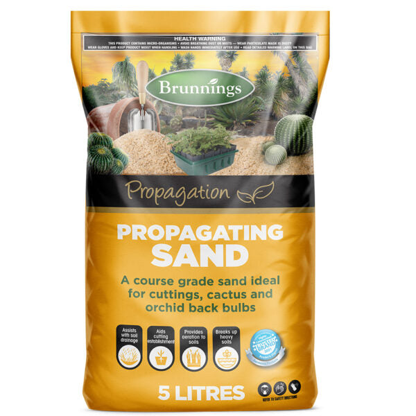 Brunnings Propagating Sand is a coarse grade sand that is ideal for cuttings, cactus and orchid back bulbs and to add to heavy clay soils to improve the drainage and prevent the clay particles sticking together.