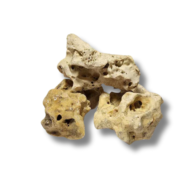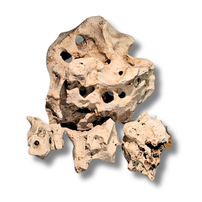 Aquarium safe Holey rock. Excellent for aquascaping but It does increase the ph and kh of the water. All pictures shown are wet and dry examples.
