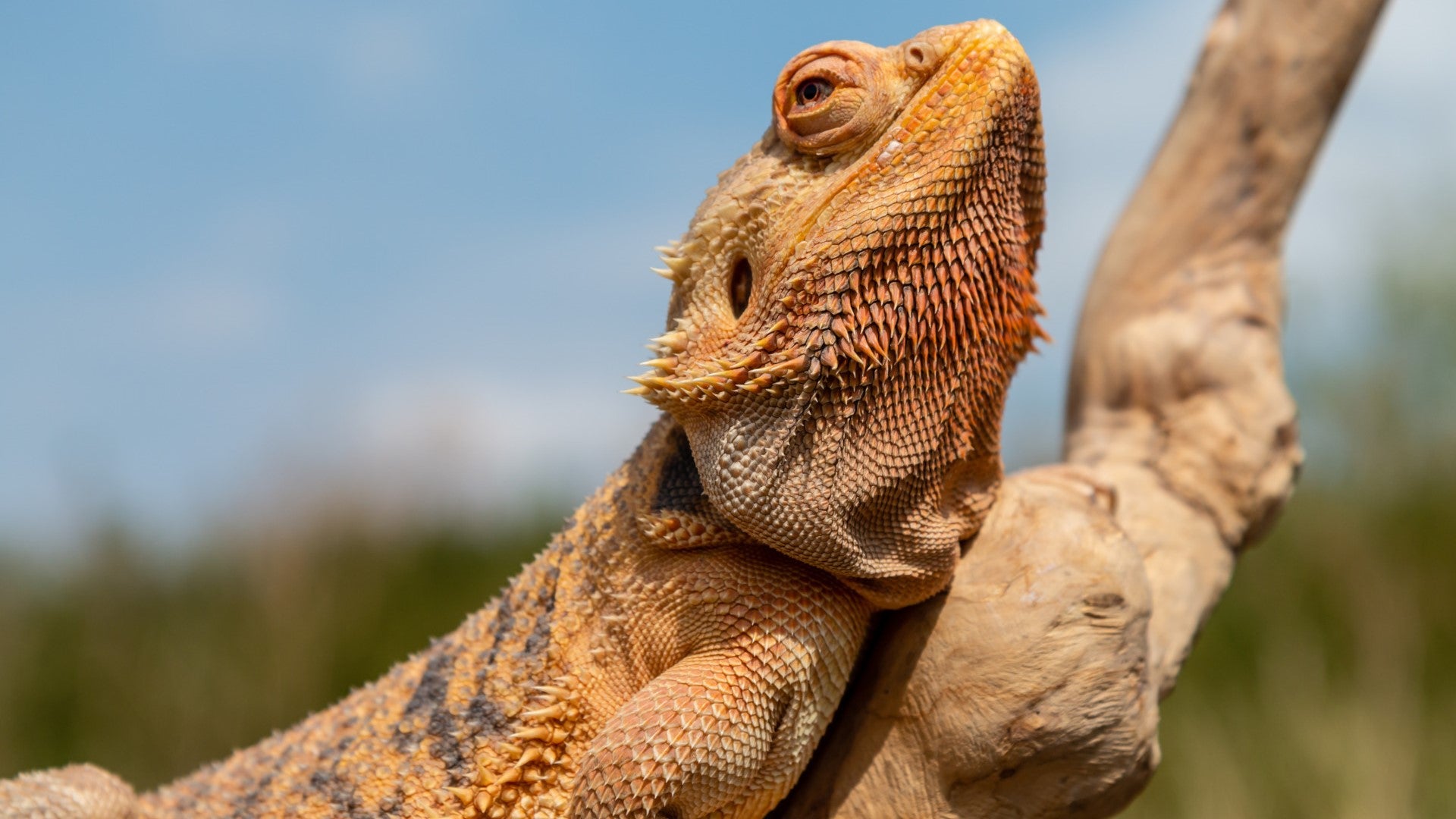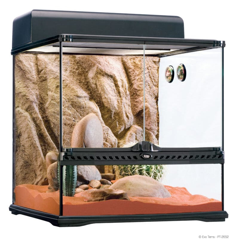 The terrarium set-up depends on the size and age of your bearded dragon. You will want an enclosure that is at least 120 x 45 x 60cm minimum for an adult and 90 x 45 x 45cm for a juvenile, lined with a sandy substrate or reusable reptile carpets. They do like to climb so include perches and logs or branches for them to explore. This will mimic their natural habitat and allow them to climb closer to the heat emitters when they need extra warmth. They prefer a low humidity environment so shallow water dishes are recommended and to be placed on the cool side of their enclosure. You should clean their home regularly with a reptile safe cleaner to prevent them from getting skin or bacterial infections. Swap out their carpet with a clean one or sift their sand to remove faeces, skin shed or uneaten food. Always provide fresh drinking water daily and lightly misting their habitat every few days will encourage them to drink.