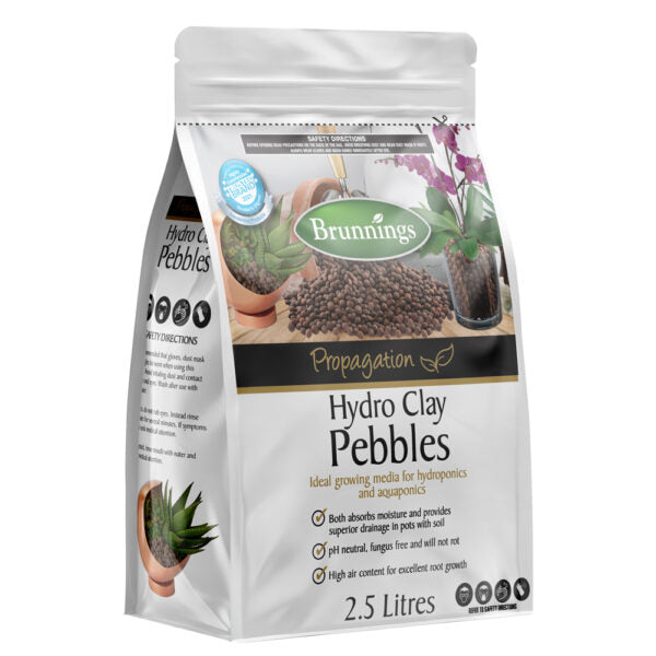 Brunnings Hydro Clay Pebbles are a baked clay balls made by baking and tumbling natural clay at high temperatures.