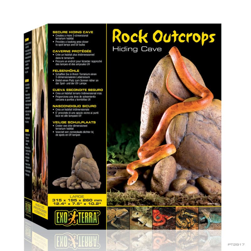 Exo Terra Rock Outcrops help create a more 3-dimensional habitat in all types of terrariums. The shape of these Rock Outcrops enables them to fit nicely in small spaces, minimizing wasted space within the terrarium and generating basking areas closer to the top screen. The multiple entrance holes turn this Rock Outcrop into a secure hiding space, preventing stress. The Rock Outcrops provide a basking area closer to spot lamps and UV bulbs.