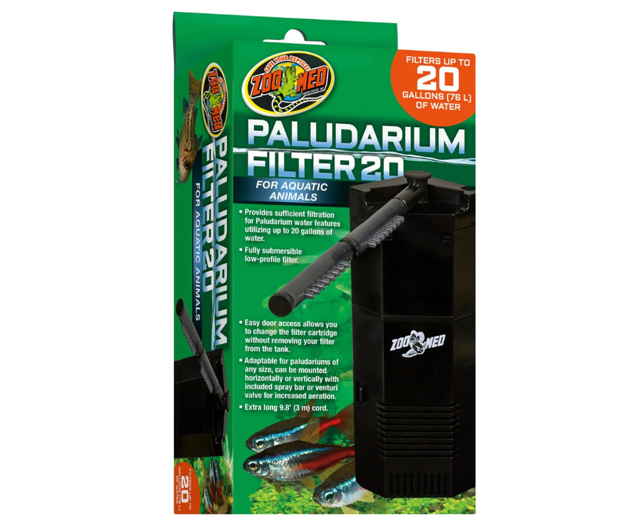 The perfect, small-profile filter for use in a paludarium or other smaller water feature or setup. Zoo Med's Paludarium filter is fully-submersible, and includes a spray bar return to act as a gentle trickle back into your setup. Easy-access filter door makes it easy to change out media without fully removing the filter and disturbing your landscape.